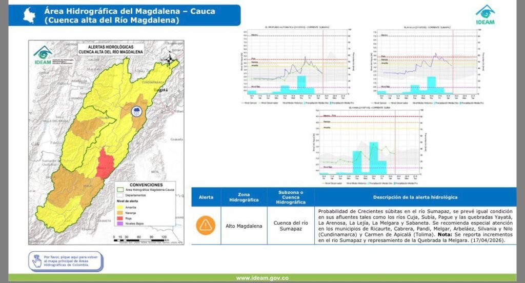 La situación se torna aún más delicada en la cuenca del río Sumapaz, así lo señaló en La Voz del Pueblo Andrea Mayorquin, directora de Ambiente del Tolima, donde particularmente en Melgar se mantiene vigilancia sobre la quebrada La Melgara y sectores como Carmen de Apicalá, ante posibles crecientes súbitas.