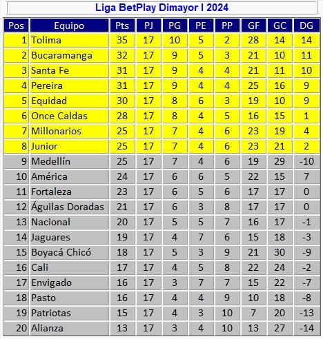 ASÍ QUEDÓ LA TABLA DE POSICIONES TRAS LA FECHA 18 DE LA LIGA BETPLAY 2024-1.
