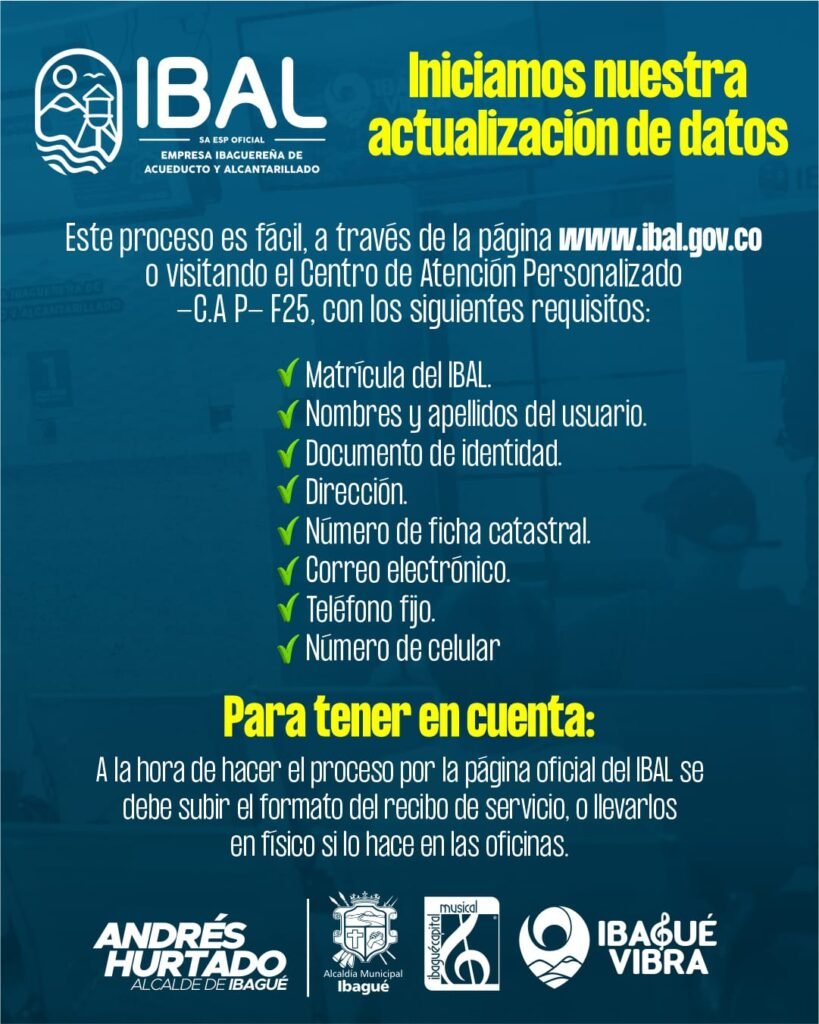 La Empresa Ibaguereña de Acueducto y Alcantarillado, IBAL, continúa transformando sus procesos de gestión. En esta oportunidad, invita a sus usuarios a actualizar sus datos y de esta manera, acceder de forma ágil y segura a los programas que maneja.
