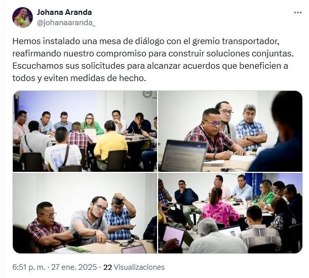 En su cuenta de X, la Alcaldesa Aranda compartió: “seguimos avanzando en la mesa de trabajo con el gremio transportador, reafirmando nuestro compromiso con el diálogo. Agradecemos el acompañamiento de la Procuraduría y la Defensoría del Pueblo, cuya presencia garantiza transparencia y equilibrio en este proceso”.