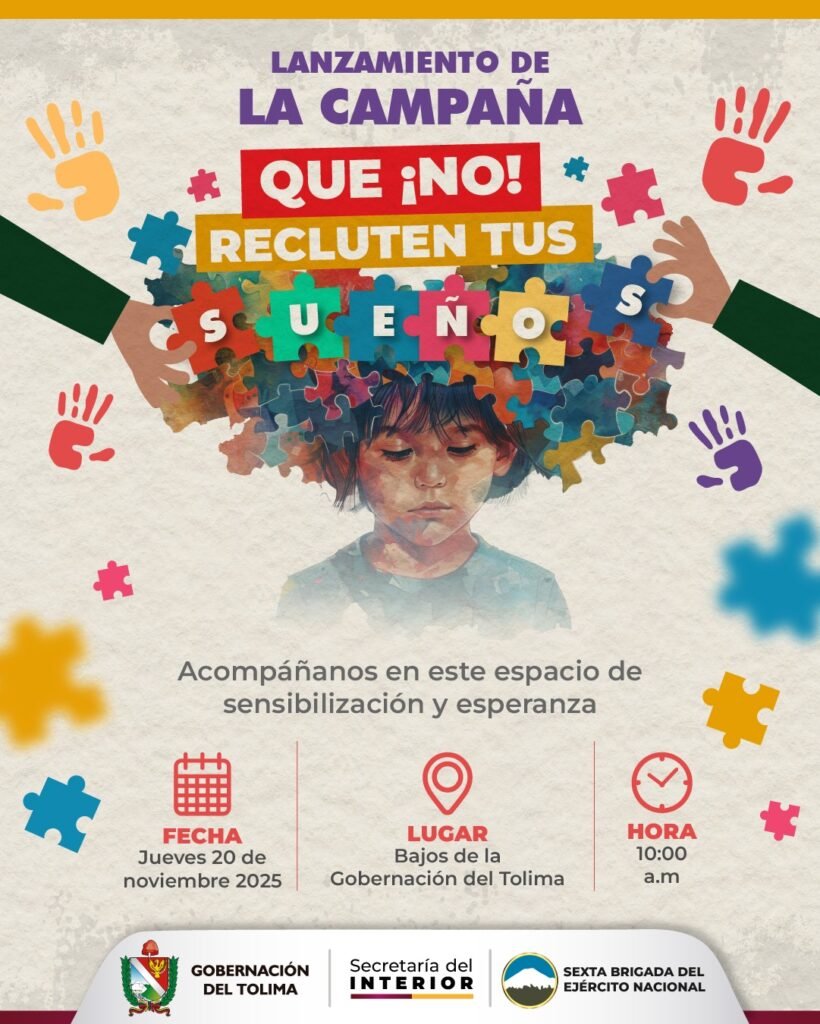 Con la estrategia ‘Que no recluten tus sueños’, en el Tolima se busca evitar la aparición de casos incorporación ilegal y forzada de menores a las filas de grupos al margen de la ley, como ha venido ocurriendo en otros departamentos.