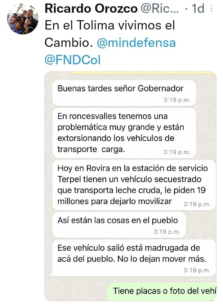 El funcionario, Eyber Javier Triana señaló que la denuncia se la hicieron al gobernador Orozco a través de mensajes de whatsapp donde advirtieron de secuestros a vehículo de carga, por los que estarían exigiendo gruesas sumas de dinero para permitir su movilidad, pero que de manera formal nadie se ha acercado a las autoridades para dar a conocer lo sucedido.