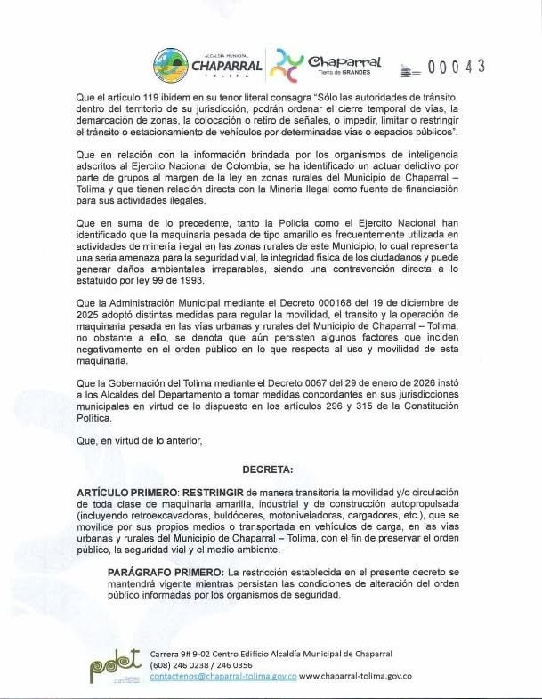La Alcaldía de Chaparral expidió el Decreto 0043 del 25 de marzo de 2026, mediante el cual se adoptan medidas transitorias para garantizar la convivencia, la seguridad y la preservación del orden público, además de establecer la restricción en la movilidad de maquinaria amarilla dentro del municipio.
