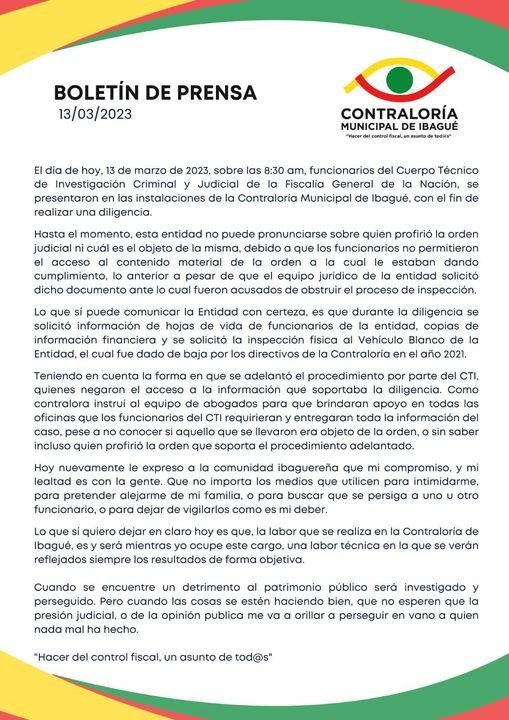 La Contraloría Municipal de Ibagué se pronunció frente a la diligencia realizada por miembros del CTI que se tomaron el órgano de control fiscal, para solicitar información oficial para investigar presuntas irregularidades y asegura que la diligencia fue irregular.