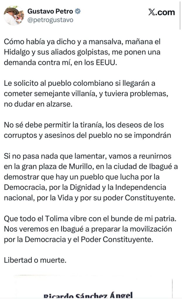 Añadió: “Muy seguramente traerá a las comunidades indígenas del sur del Tolima, a las cuales, mantiene engrasando frecuentemente, porque de manera voluntaria, los únicos que llenan el Parque Murillo Toro, los que llenen las calles de Ibagué sin un solo peso, sin refrigerio y sin que le paguen, es la gente honorable que sale a marchar en una profunda decepción de este gobierno de Gustavo Petro”.