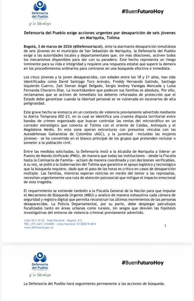 La Defensoría del Pueblo lanzó una exigencia urgente a las autoridades tras la desaparición simultánea de seis jóvenes en San Sebastián de Mariquita, un hecho que calificó como de “riesgo inminente” para la vida e integridad de las víctimas.
