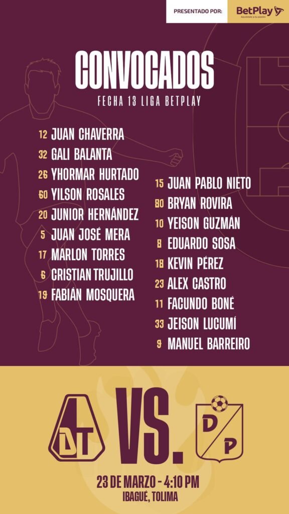 Por tal motivo ya se dió a conocer los 18 convocados por el estratega pijao, sin embargo es importante recordar que figuras claves del equipo pijao están en Departamento médico, entre ellos Anderson Angulo quién continúa en su proceso de recuperación de un esguince en cuello de pie derecho.