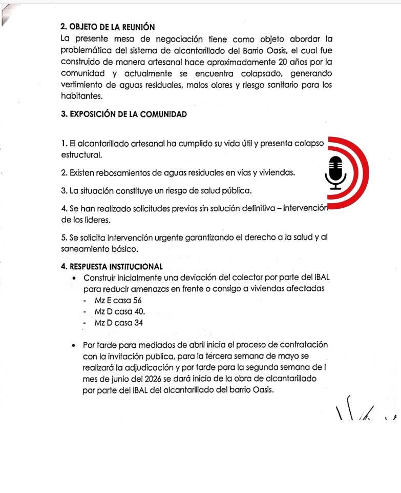 Asimismo, que por tarde para mediados de abril inicia el proceso de contratación con la invitación pública, para la tercera semana de mayo se realizará la adjudicación y por tarde para la segunda semana de junio del 2026 se dará inicio de la obra de alcantarillado por parte del IBAL del alcantarillado del barrio Oasis.