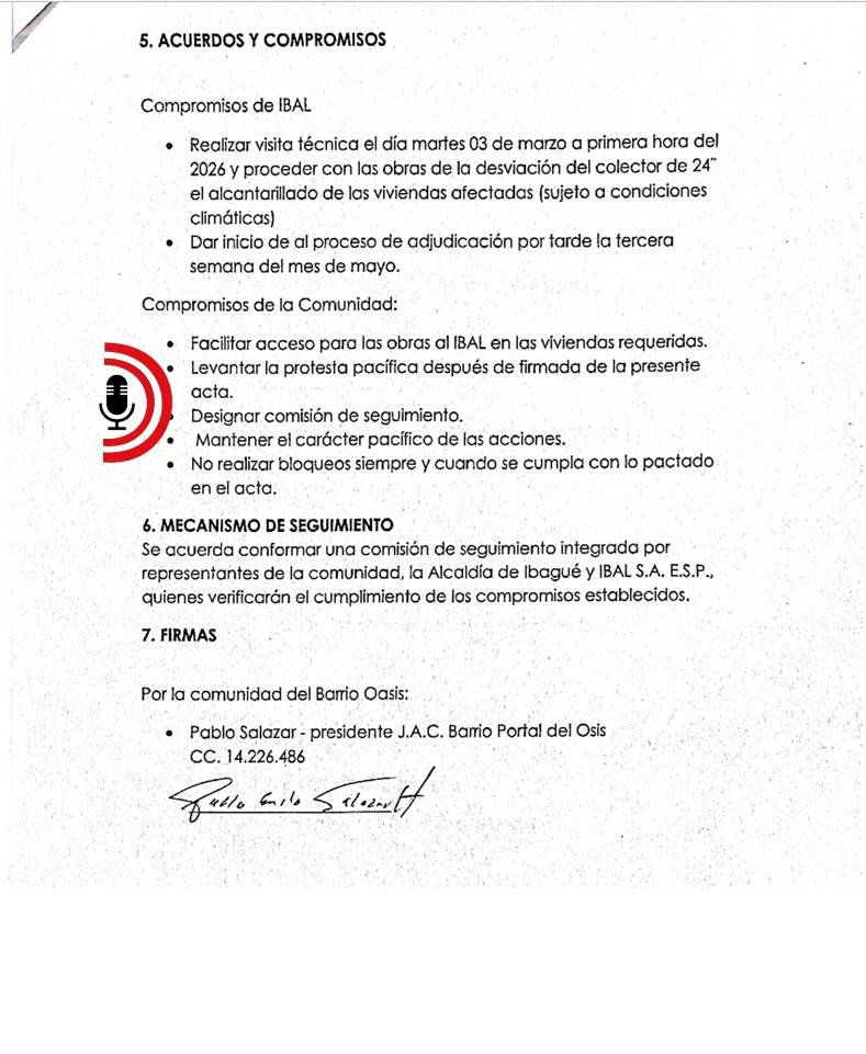 Por último, se acordó en conformar una comisión de seguimiento integrada por representantes de la comunidad, la Alcaldía de Ibagué y IBAL S.A. E.S.P., quienes verificarán el cumplimiento de los compromisos establecidos.