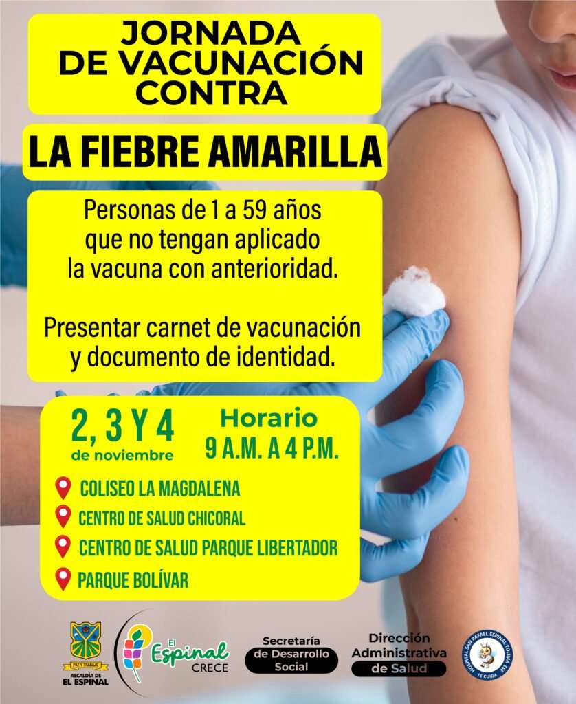 Siguiendo las directrices del Ministerio de Salud y considerando que el Tolima se encuentra en estado de emergencia, la Alcaldía de El Espinal hace un llamado a la comunidad para que participe en la jornada de vacunación contra la fiebre amarilla que se realizará este fin de semana.