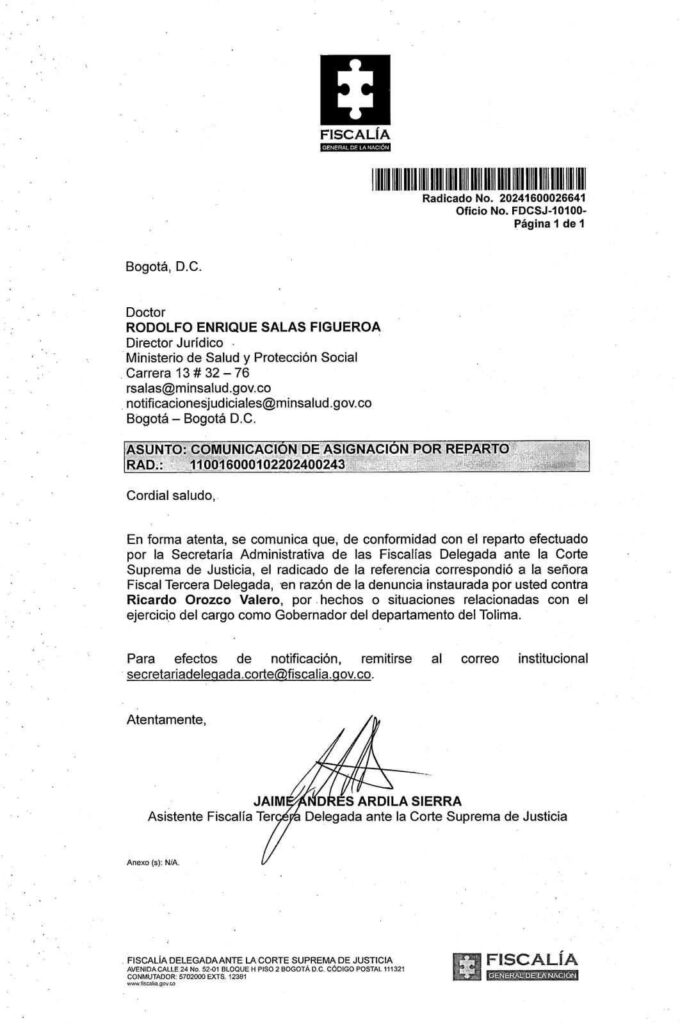 La Fiscalía General de la Nación notificó formalmente al director jurídico del Ministerio de Salud, Rodolfo Salas, sobre la asignación del caso mediante reparto. El trámite se adelantó en la secretaría administrativa de las fiscalías delegadas ante la Corte Suprema, dado que Orozco cuenta con fuero especial por su condición de exmandatario departamental.