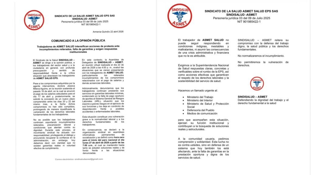 La tensión laboral en Asmet Salud llegó a su punto más crítico con el inicio de un nuevo paro nacional indefinido por parte de sus trabajadores, quienes denuncian incumplimientos reiterados en sus pagos.