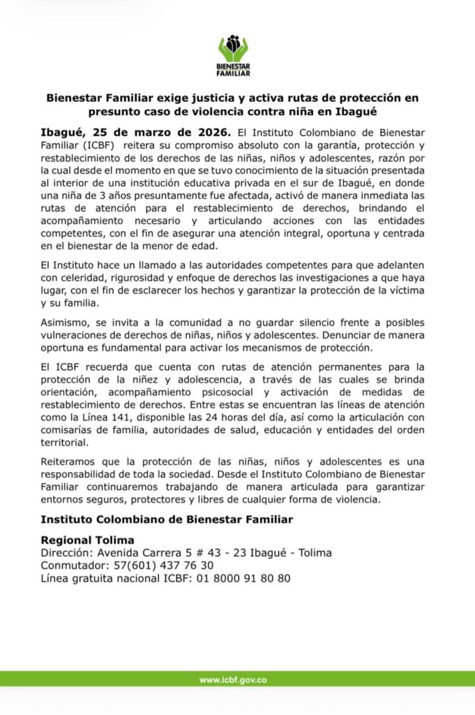 El Instituto Colombiano de Bienestar Familiar (ICBF) informó que activó rutas de atención luego de conocer un presunto caso de violencia contra una niña de 3 años en una institución educativa privada ubicada en el sur de Ibagué.