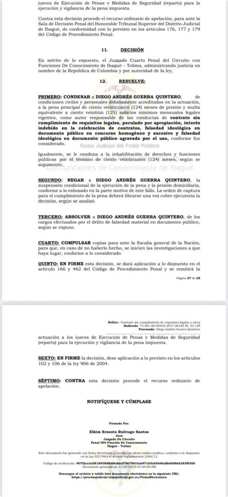 Diego Andrés Guerra Quintero por los delitos de Contrato sin el cumplimiento de requisitos legales, peculado por apropiación, interés indebido en la celebración de contratos, falsedad ideológica en documento público en concurso homogéneo y sucesivo y falsedad ideológica en documento público agravada por el uso.