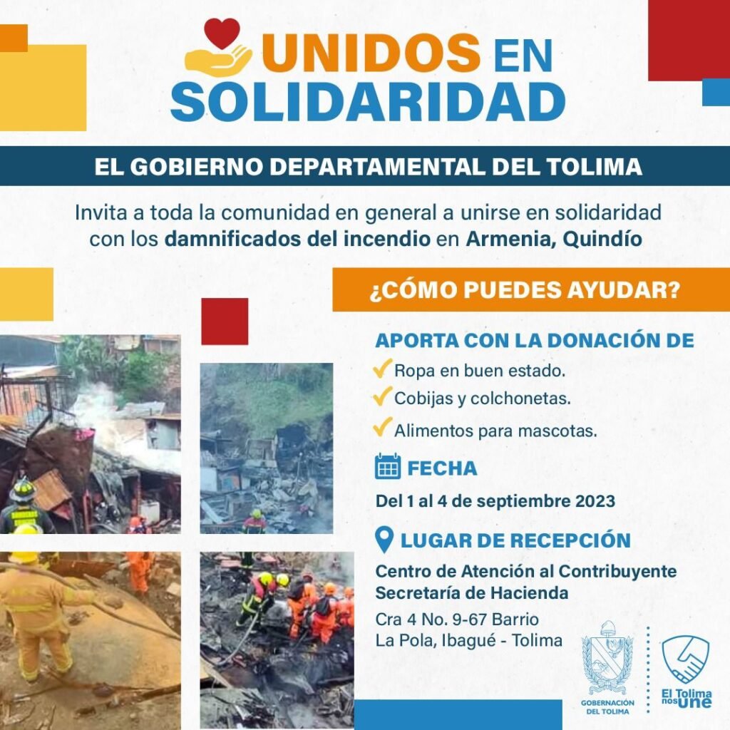 “La invitación es a unirnos en solidaridad por los damnificados del incendio en Armenia, quienes el 28 de agosto, donde fueron afectadas más de 280 personas, entre ellos más de 90 niños. Se consumieron en llamas estas viviendas que estaban construidas en guadua y lo que queremos es tocar los corazones de todos ustedes para donar todo tipo de elementos, que pueden llevarlos al centro de atención al contribuyente, ubicado en la carrera Cuarta con Novena”, señaló la Secretaria de Hacienda del Tolima, María del Carmen Muñoz.