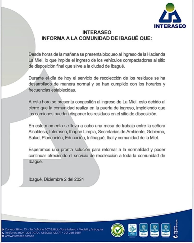 Por último, destacó que se llevaba a cabo una reunión, una mesa de trabajo entre la Alcaldesa, Interaseo, Ibagué, Limpia, las Secretarías de Salud, Ambiente y Gestión del Riesgo, Gobierno, Planeación, Educación, así como Infibagué, el Ibal, y la comunidad de La Miel.