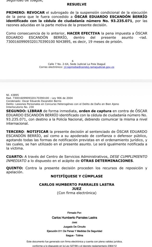 Lo que comenzó como una riña en medio de las festividades de San Juan y San Pedro en Ibagué, terminó convirtiéndose en un complejo proceso judicial que hoy tiene al boxeador ibaguereño, Óscar Eduardo Escandón Berrío, con una orden de captura vigente en Colombia.