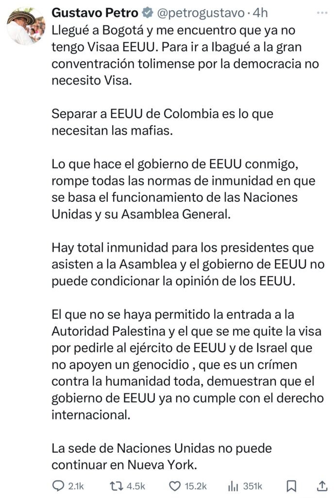 En un mensaje de X el Presidente Gustavo Petro mencionó a Ibagué al referirse a la revocatoria de su visa de entrada a Estados Unidos. El mandatario dijo que no necesita visa para venir a la capital tolimense. Cabe recordar que el Jefe de Estado anunció una concentración en la plaza Murillo Toro ubicada frente a la gobernación del departamento, la cual está programada para el próximo viernes 3 de octubre.