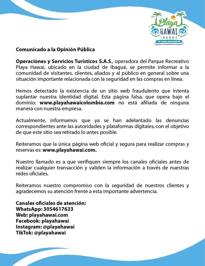 La empresa Operaciones y Servicios Turísticos S.A.S., operadora del Parque Recreativo Playa Hawai en Ibagué, informó sobre la detección de un sitio web que suplanta su identidad digital.