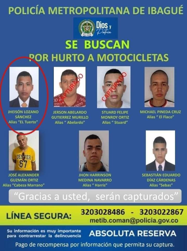 Añadió el oficial, “se logra identificar después de solicitar unos antecedentes que tienen una orden de captura por el delito de hurto calificado. Este sujeto hace parte del cartel más buscado de la ciudad de Ibagué por el delito de hurto de motocicletas”.
