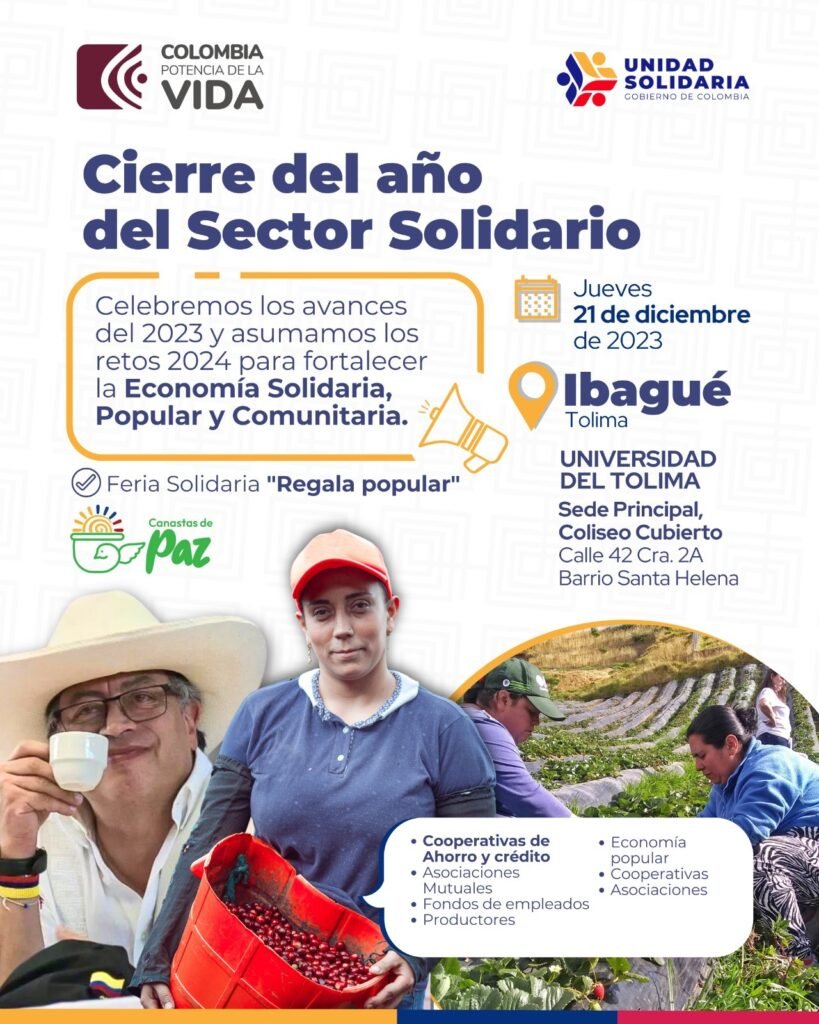 La visita presidencial se realizará con el objetivo de hacer un balance del trabajo adelantado durante la vigencia 2023 para fortalecer a las organizaciones que hacen parte del sector solidario, popular y comunitario e identificar los retos que se presentan para el 2024, la Unidad Administrativa Especial de Organizaciones Solidarias (Unidad Solidaria), que se realizará el jueves 21 de diciembre, en Ibagué.