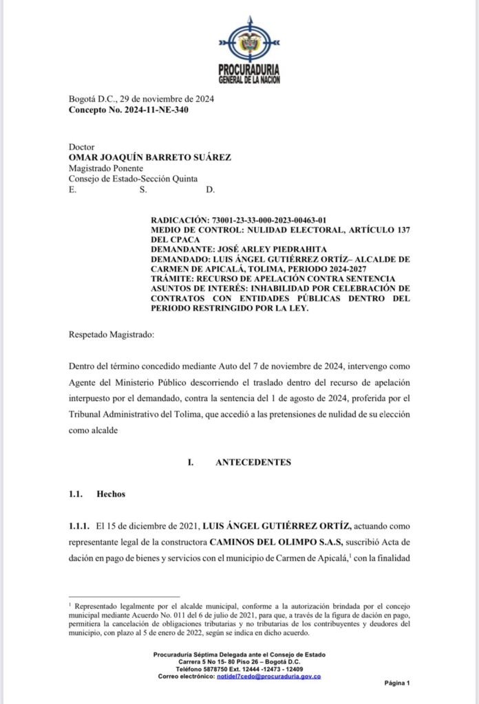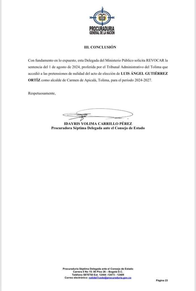 En un giro inesperado, la Procuraduría General de la Nación ha emitido un concepto favorable para que el alcalde de Carmen de Apicalá, Luis Ángel Gutiérrez, continúe en su cargo. Esta postura contrasta con la decisión previa del Tribunal Administrativo del Tolima, que en primera instancia anuló su elección por presunta inhabilidad.