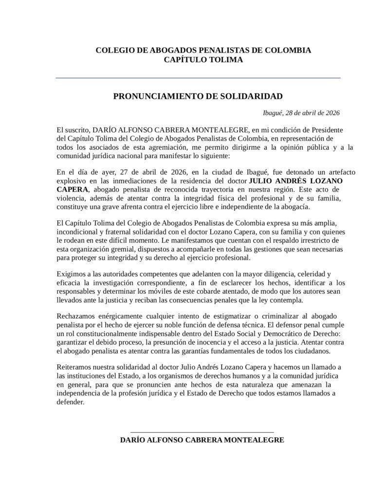 El Colegio de Abogados Penalistas del Tolima pidió investigar el envío de un artefacto explosivo a la residencia del jurista y expresó respaldo al profesional.