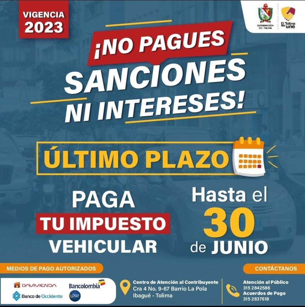 Invitamos a todos los propietarios de vehículos en el Tolima a aprovechar esta oportunidad y cumplir con el pago del Impuesto Vehicular antes del 30 de junio, evitando así sanciones y cargos adicionales. El cumplimiento de esta obligación contribuye al desarrollo y bienestar del departamento.