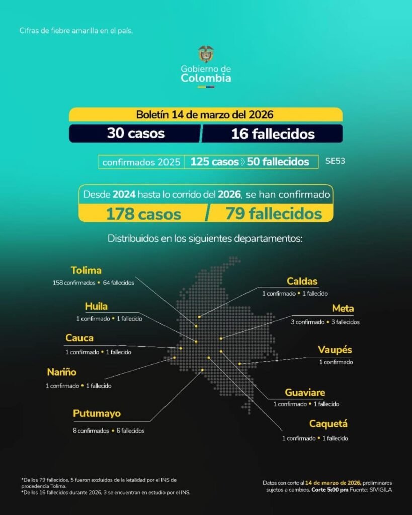 El Tolima continúa liderando el preocupante panorama nacional por fiebre amarilla. De acuerdo con el más reciente boletín del Ministerio de Salud, con corte al 14 de marzo, el departamento sumó un nuevo fallecimiento, elevando a 64 el número de víctimas mortales y a 158 los casos confirmados en lo corrido de 2026.